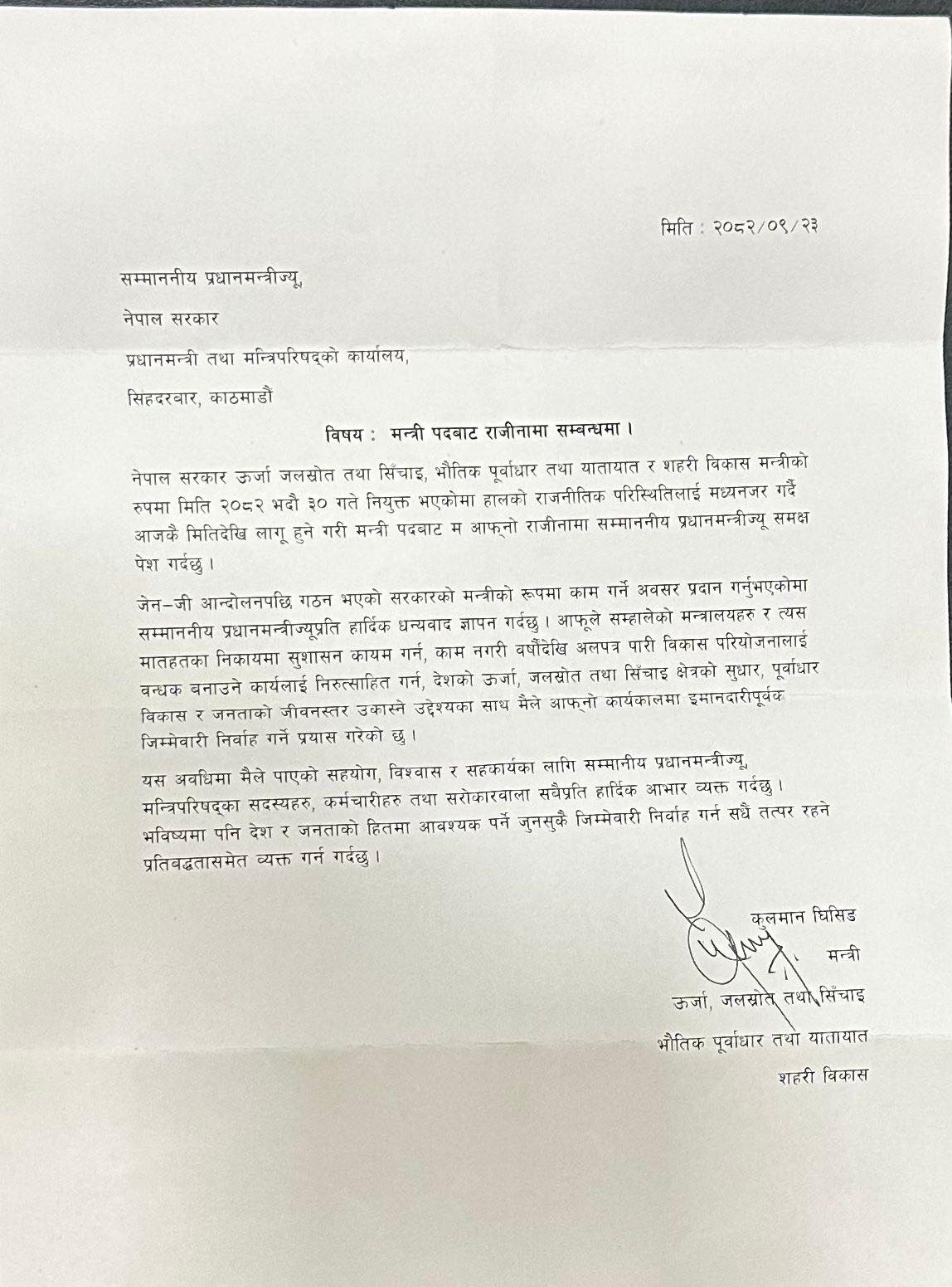 बुधबार साँझ उनी बालुवाटार पुगेर प्रधानमन्त्री सुशीला कार्कीसमक्ष औपचारिक रूपमा राजीनामा पेश गरेका हुन्।