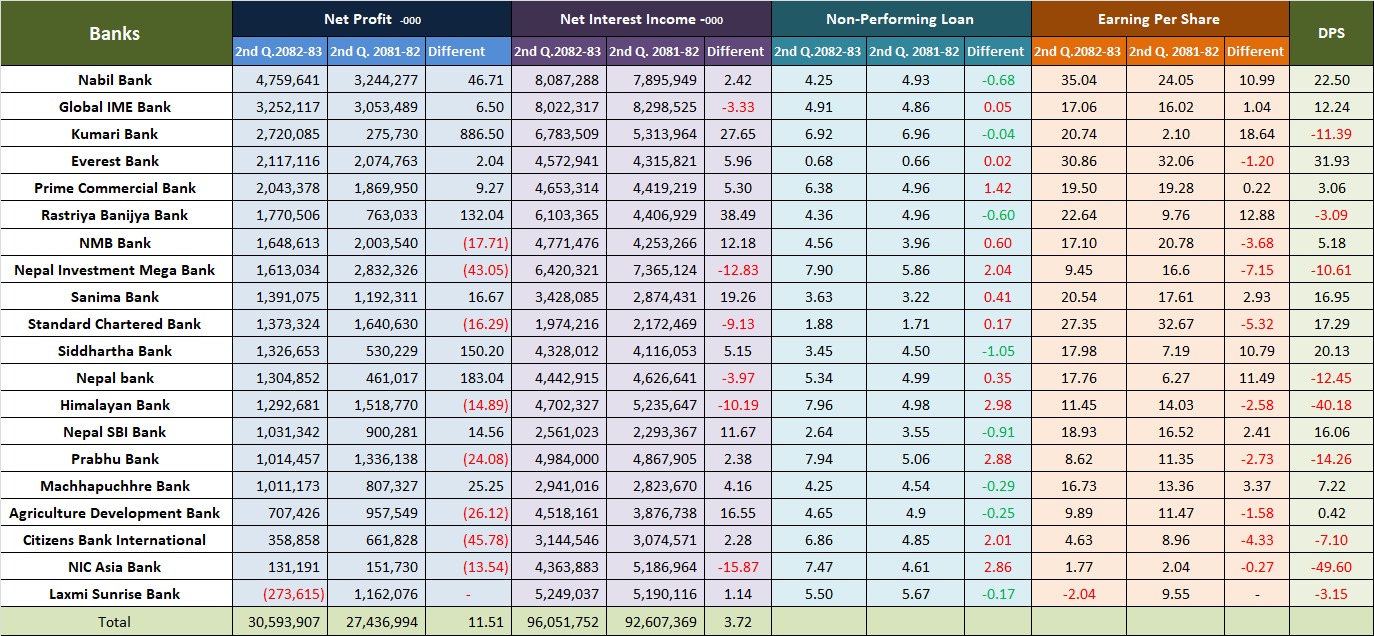 यस अवधिसम्म आइपुग्दा बैंकहरुको खुद ब्याज आम्दानी बढ्दा र इम्पेयरमेन्ट चार्ज घट्दा नाफा बढ्न टेवा पुगेको छ । दोस्रो त्रैमाससम्म लक्ष्मी सनराइज बैंक बाहेक सबै बैंक नाफामा देखिएका छन् ।