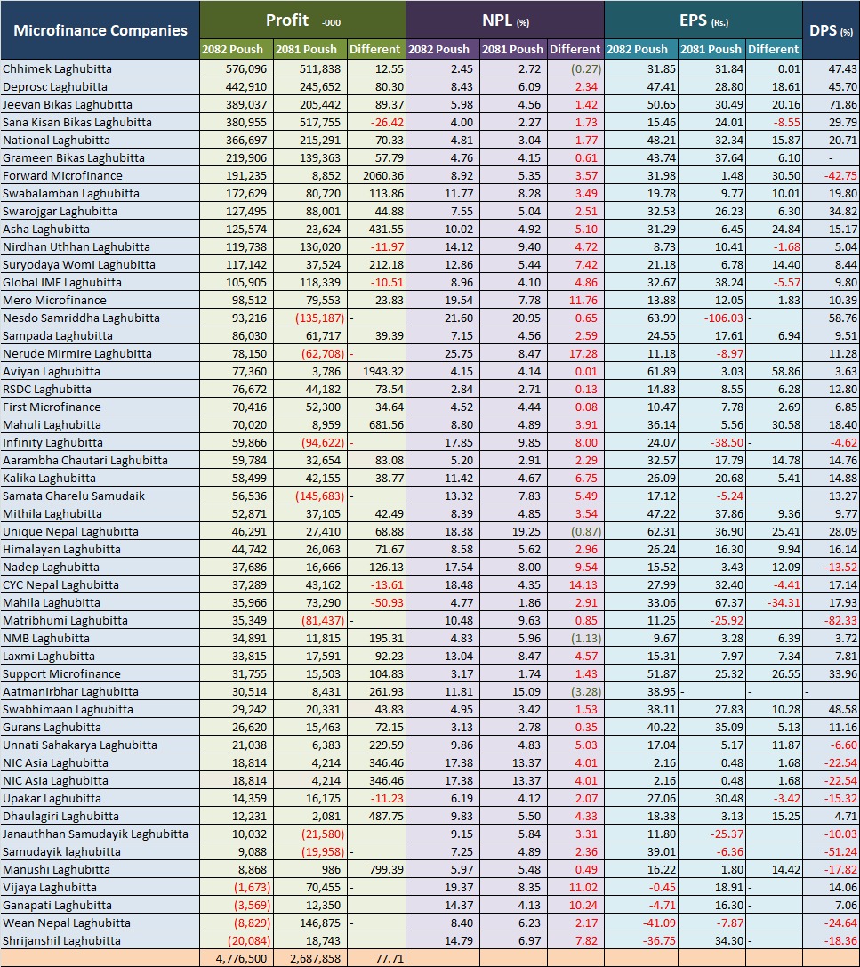 यो नाफा गत आवको सोही अवधिसम्मको तुलनामा ७७.७१ प्रतिशत बढी हो । ७७.७१ प्रतिशत बढी हो । गत आवको सोही अवधिसम्म लुघवित्त संस्थाहरुले २ अर्ब ६८ करोड ७८ लाख रुपैयाँ नाफा कमाएका थिए ।