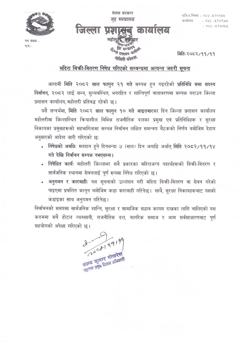 काठमाण्डौ । फागुन २१ गते हुने प्रतिनिधि सभा सदस्य निर्वाचनलाई लक्षित गर्दै महोत्तरी जिल्लामा डिजे र मदिरा माथि प्रतिबन्ध लगाइएको छ। जिल्ला प्रशासन कार्यालय महोत्तरीले सार्वजनिक सूचना जारी गर्दै निर्वाचनको समयमा शान्ति सुरक्षा र सामाजिक सद्भाव कायम राख्न यस्तो निर्णय गरिएको जनाएको छ।