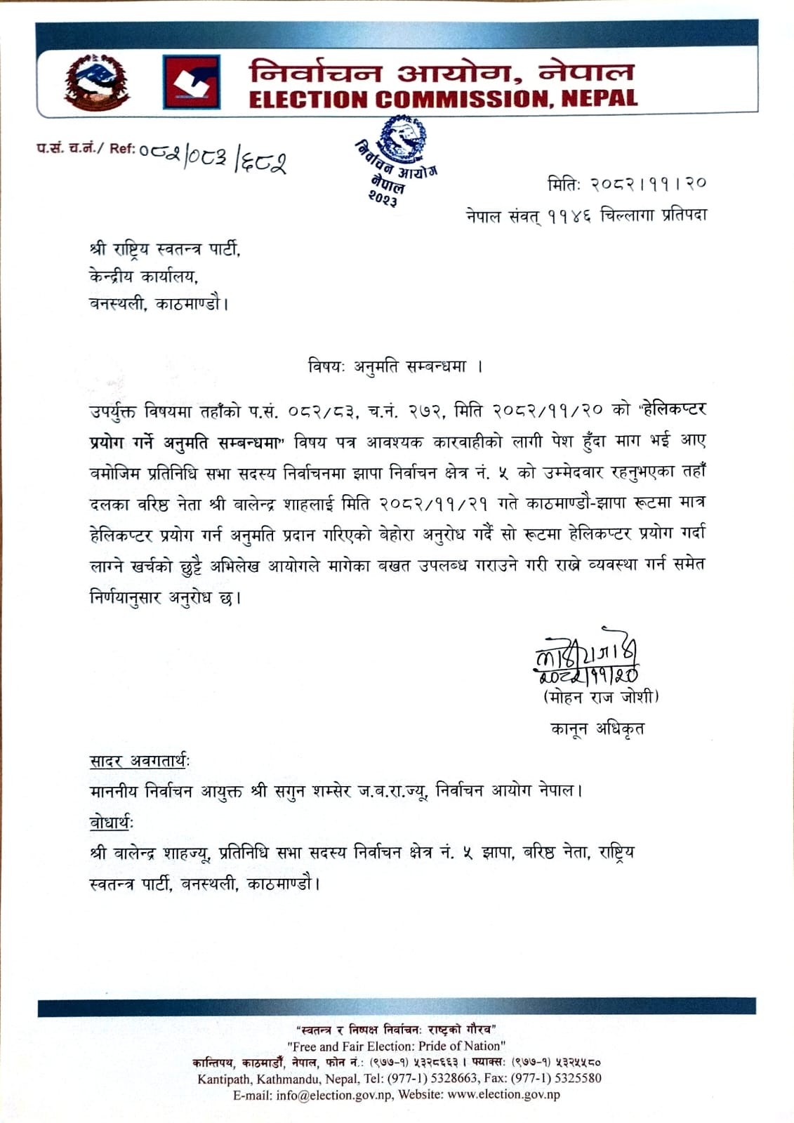 शाहको सचिवालयका एक सदस्यले निर्वाचन आयोगबाट फागुन २० गते नै आफूहरुले हेलिकोप्टर प्रयोगको अनुमति लिएको उल्लेख गर्दै सुरक्षाको कारणले विराटनगर छेउछाउ पुगेर हेलिकोप्टर फर्काइएको बताएका हुन् ।