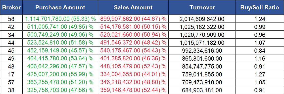 उच्च खरिद गर्ने ब्रोकरहरुमा नासा सेक्युरिटिज, डायनामिक मनि म्यानेजर्स, अनलाइन सेक्युरिटिज, एबीसी सेक्युरिटिज र आर्यतारा इन्भेष्टमेन्ट एण्ड सेक्युरिटिज रहेका छन् ।