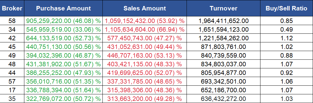 उच्च खरिद गर्ने ब्रोकरहरुमा सनि सेक्युरिटिज, इम्पेरियल सेक्युरिटिज, त्रिशक्ति सेक्युरिटिज, आर्यतारा इन्भेष्टमेन्ट एण्ड सेक्युरिटिज, एबीसी सेक्युरिटिज र कोहीनूर इन्भेष्टमेन्ट एण्ड सेक्युरिटिज रहेका छन् ।