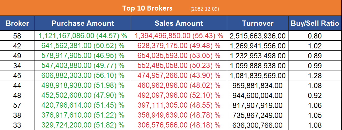 उच्च खरिद गर्ने ब्रोकरहरुमा सनि सेक्युरिटिज, इम्पेरियल सेक्युरिटिज, डायनामिक मनि म्यानेजर्स सेक्युरिटिज, आर्यतारा इन्भेष्टमेन्ट एण्ड सेक्युरिटिज, दिपशिखा धितोपत्र कारोबार कम्पनी र दक्षिणकाली इन्भेष्टमेन्ट एण्ड सेक्युरिटिज रहेका छन् ।  top 10 b