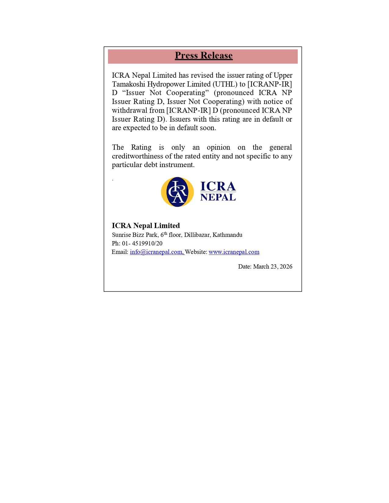 ICRA नेपालले कम्पनीले आवश्यक वित्तीय विवरण समयमै उपलब्ध नगराएको उल्लेख गर्दै ‘Issuer Not Cooperating’ श्रेणीमा वर्गीकृत गरेको जनाएको छ। यस्तो श्रेणीमा पर्ने कम्पनीहरूमा वित्तीय पारदर्शिता र दायित्व व्यवस्थापनमा कमजोरी देखिने सम्भावना उच्च हुने बताइन्छ।