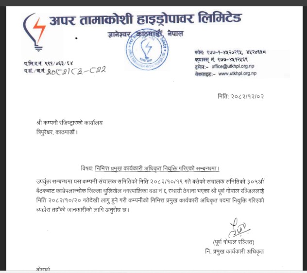 यसैबीच, कम्पनीको व्यवस्थापन तहमा पनि पछिल्लो समय महत्वपूर्ण फेरबदल भएका छन्। पूर्णगोपाल रञ्जितलाई निमित्त प्रमुख कार्यकारी अधिकृत (CEO) मा नियुक्त गरिएको छ, जुन नियुक्ति २०८२ माघ २० गतेदेखि लागू हुने भए पनि सो सूचना भने चैत २ गते मात्र सार्वजनिक गरिएको थियो।