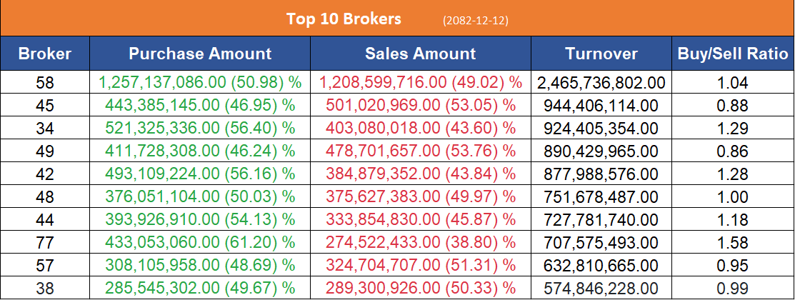 उच्च खरिद गर्ने ब्रोकरहरुमा नासा सेक्युरिटिज, भिजन सेक्युरिटिज, सनि सेक्युरिटिज, त्रिशक्ति सेक्युरिटिज, डायनामिक मनि म्यानेजर्स र नबिल स्टक डिलर लिमिटेड रहेका छन् ।