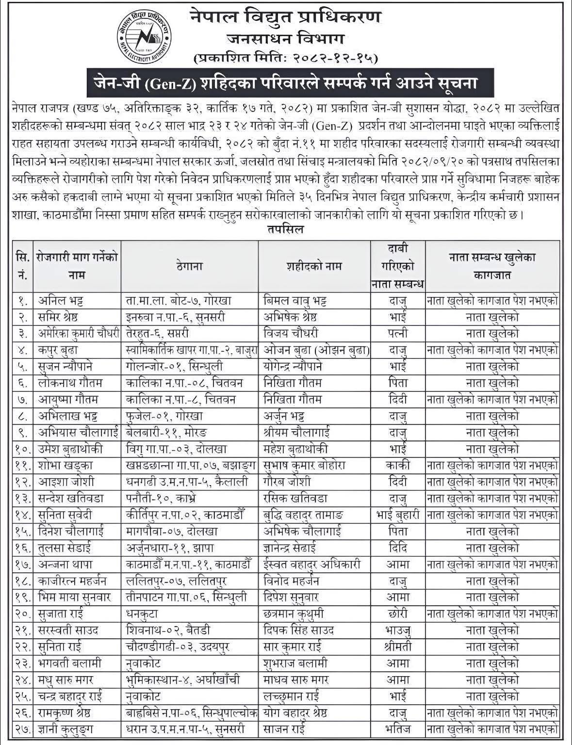 प्राधिकरणको मानव संसाधन विभागले सार्वजनिक गरेको सूचनाअनुसार शहीद परिवारका सदस्यको रूपमा दाबी गर्दै आवेदन दिएका २७ जनाको सूची सार्वजनिक गरिएको छ। ती व्यक्तिहरूलाई प्रचलित कार्यविधिअनुसार रोजगारीमा समावेश गरिने तयारी गरिएको हो।