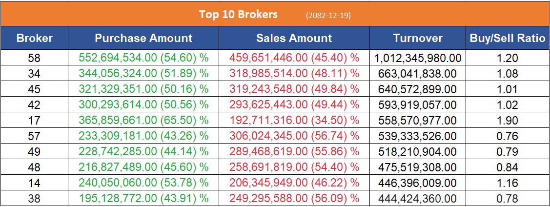उच्च खरिद गर्ने ब्रोकरहरुमा नासा सेक्युरिटिज, भिजन सेक्युरिटिज, इम्पेरियल सेक्युरिटिज, सनि सेक्युरिटिज, एबीसी सेक्युरिटिज र नेपाव स्टक हाउस रहेका छन् ।