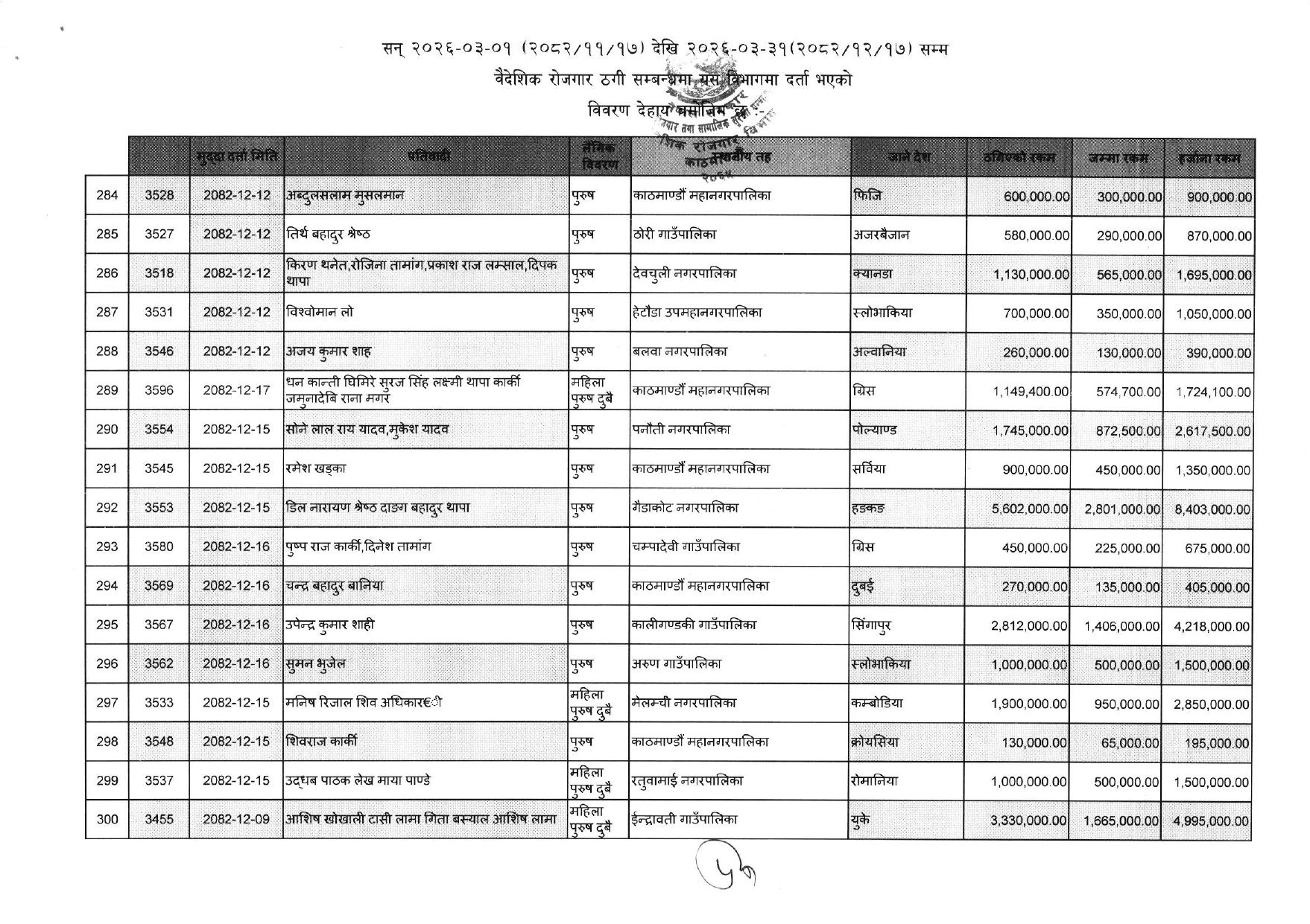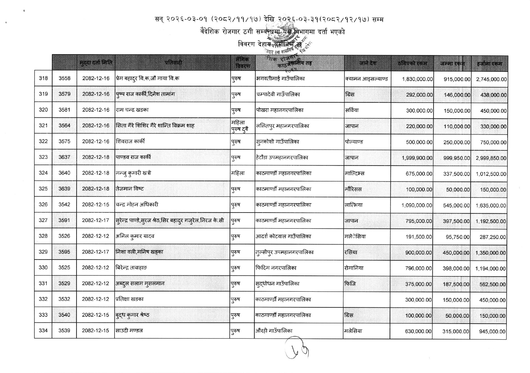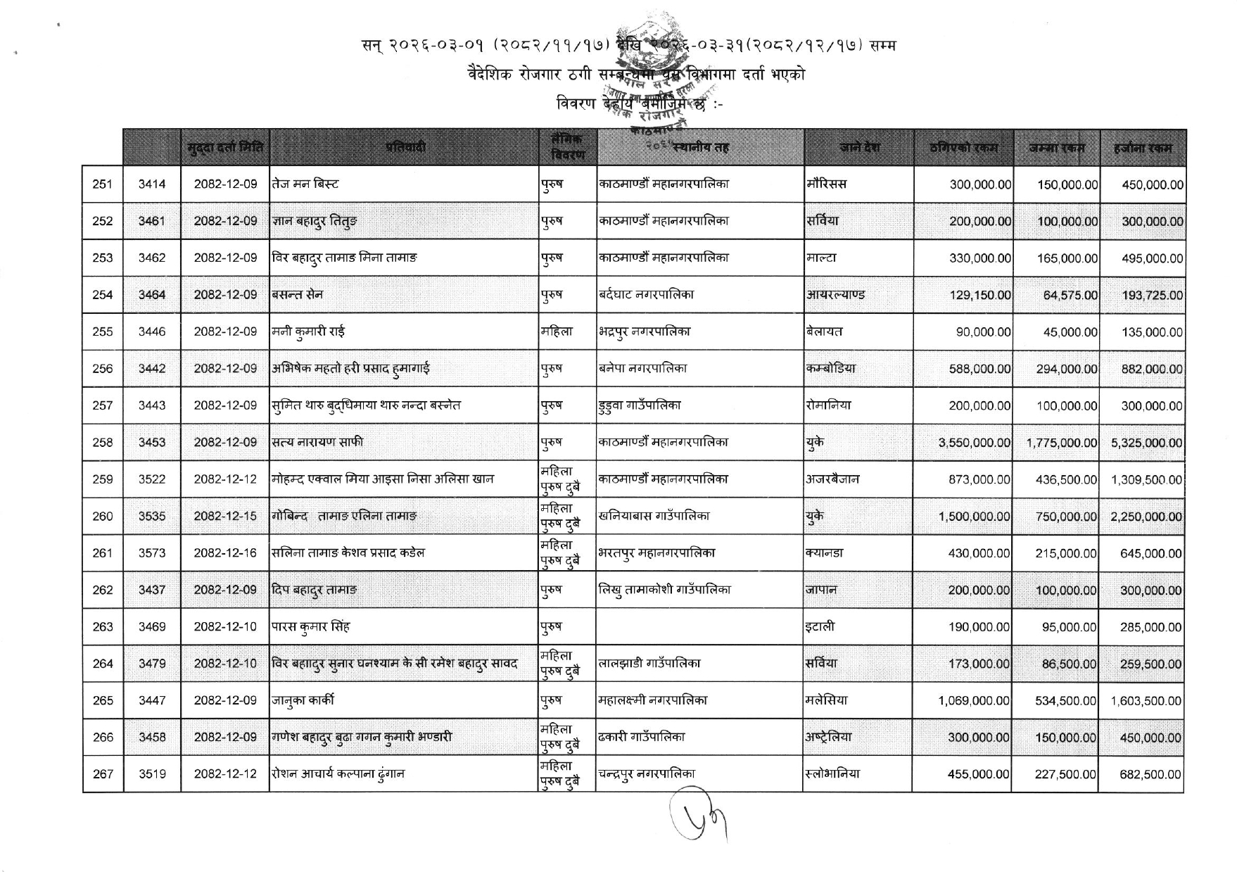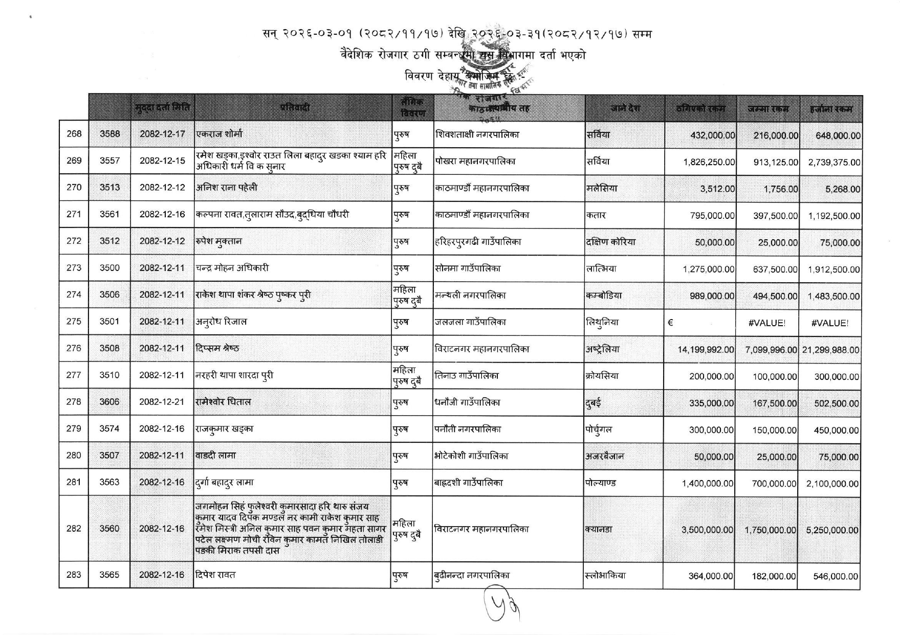 विभिन्न आकर्षक गन्तव्य-देश) लगिदिने भन्दै व्यक्तिगत रुपमा करोडौं ठगी गरेका ३५२ जनाको नाम विभागले एकैपटक सार्वजनिक गरिदिएसँगै वैदेशिक रोजगारको क्षेत्रमा हलचल मच्चिएको छ ।
