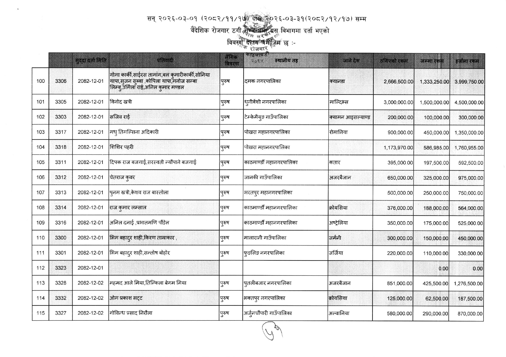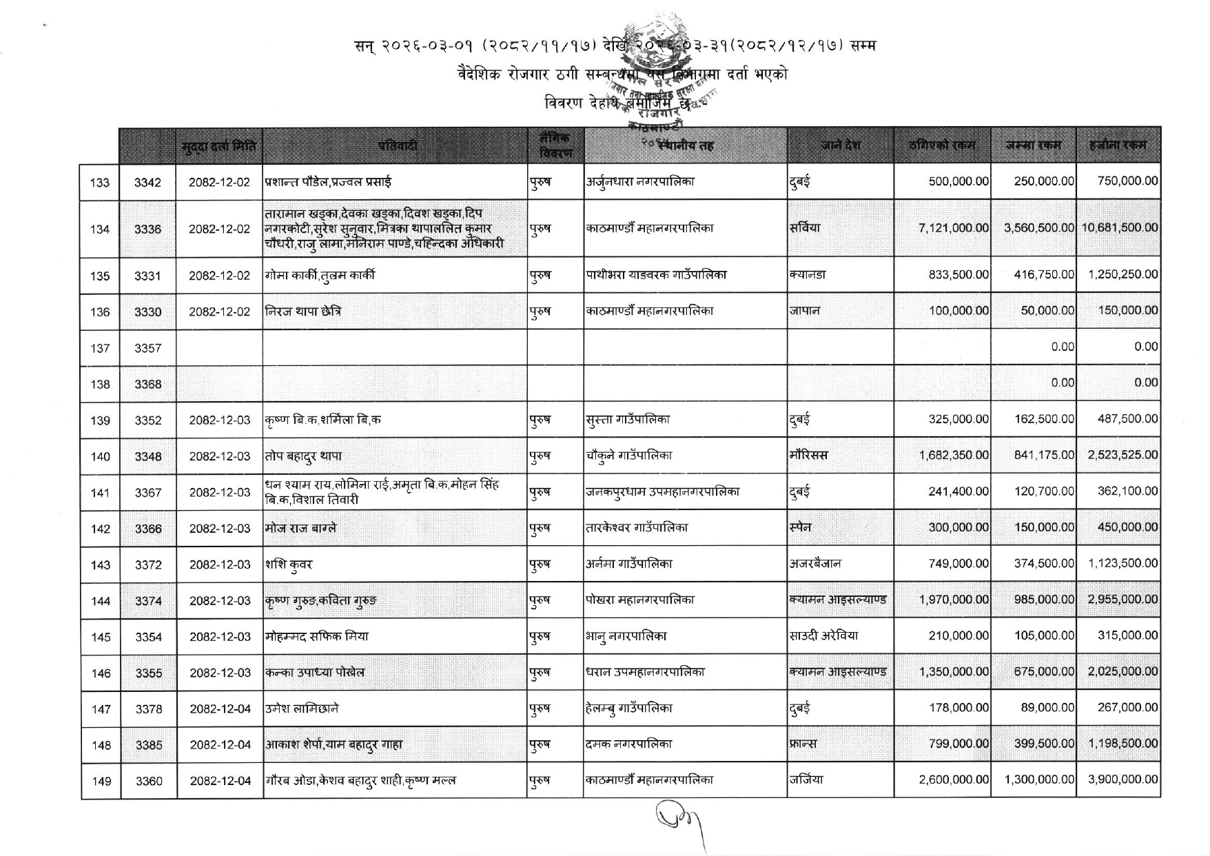 काठमाण्डौ । श्रम, रोजगार तथा सामाजिक सुरक्षा मन्त्रालय अन्तरगतको वैदेशिक रोजगार विभागले पछिल्लो एक महिनाको अवधिमा वैदेशिक रोजगार सम्बन्धी कसूर गरी उजुरी परेका सयौंको नाम एकैपटक सार्वजनिक गरिदिएको छ ।