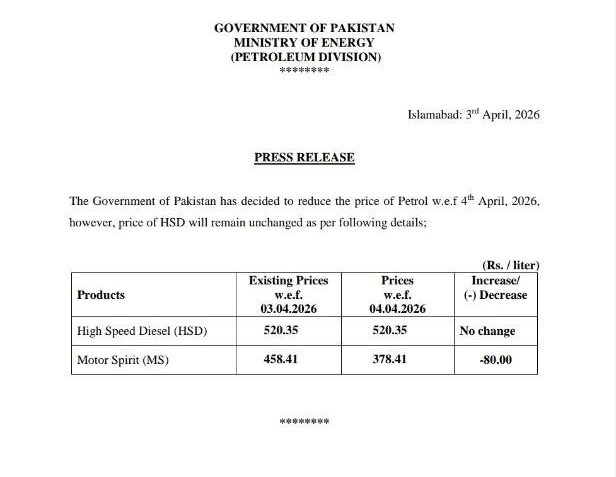 पाकिस्तानी प्रधानमन्त्री शहबाज शरीफ ले पेट्रोलको मूल्य प्रतिलिटर ८० रुपैयाँ घटाउने घोषणा गरेका छन्। यस निर्णयसँगै पेट्रोलको मूल्य ४५८ रुपैयाँभन्दा माथिबाट घटेर प्रतिलिटर ३७८ रुपैयाँ कायम गरिएको छ, जुन नयाँ दर मध्यरातदेखि लागू भएको छ।