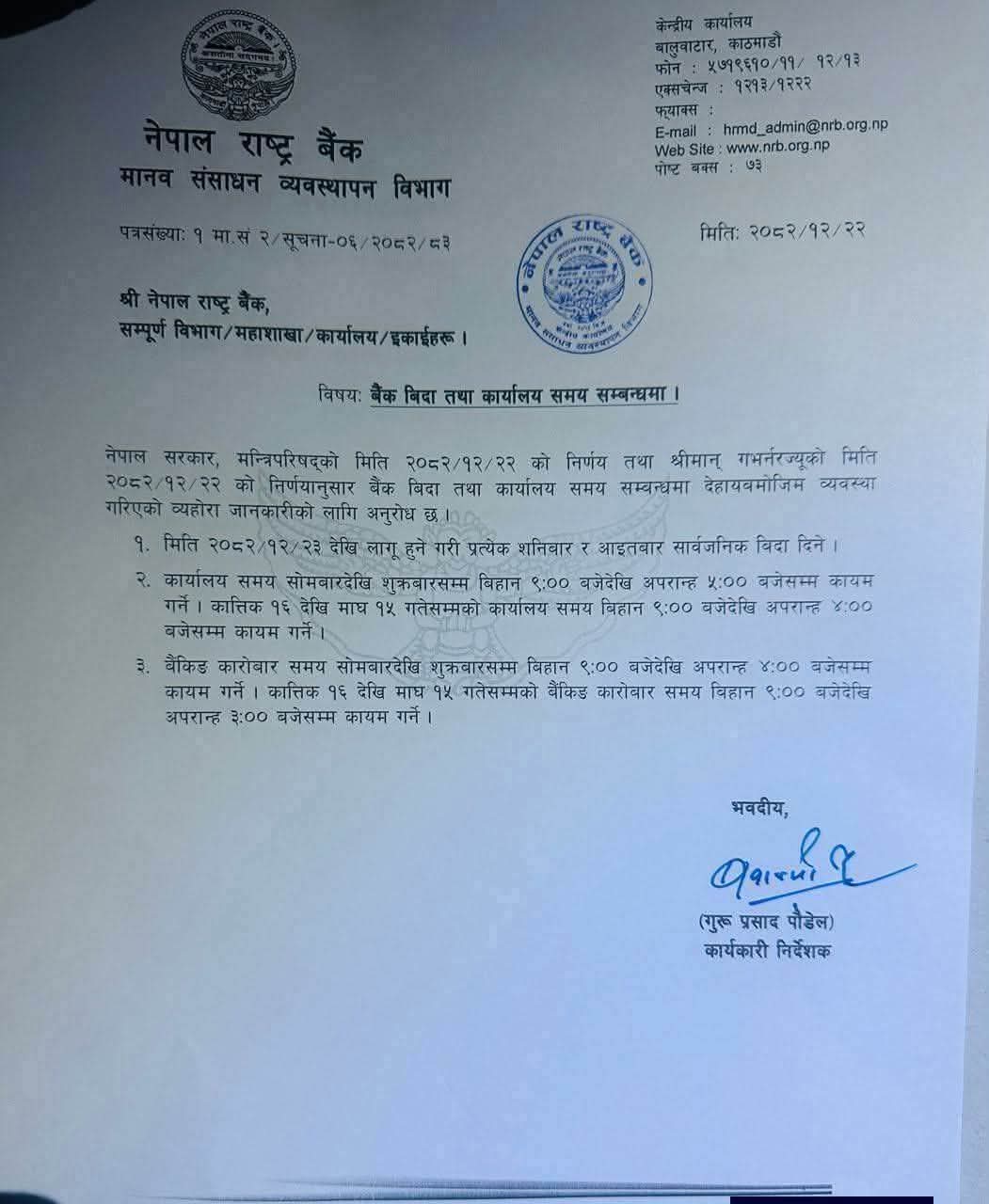 नेपाल राष्ट्रबैंकको मानव संसाधन व्यवस्थापन विभागले एक सूचना प्रकाशित गर्दै बैंक विदा तथा कार्यालय समयका विषयमा नयाँ व्यवस्था गरेको हो ।