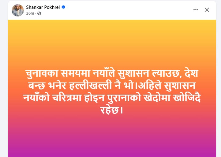 उनले लेखेका छन्, “चुनावका समयमा नयाँले सुशासन ल्याउँछ, देश बन्छ भनेर हल्लीखल्ली नै भो। अहिले सुशासन नयाँको चरित्रमा होइन, पुरानाको खेदोमा खोजिँदै रहेछ।”