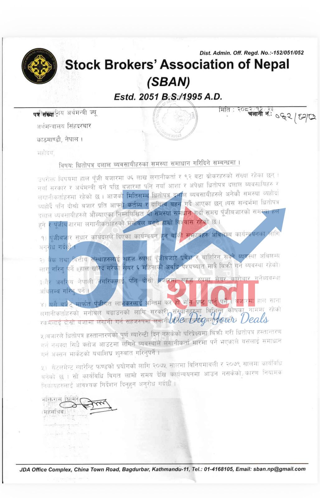 अर्थमन्त्रीले बोलाएर बिहान पुगेका ब्रोकरहरुले स्टक ब्रोकर एशोसिएसन अफ नेपालको तर्फबाट ६ बुँदे मागपत्र समेत पेश गरेका थिए । ब्रोकरहरूले बजारमा देखिएको अनिश्चितता घटाउन नीतिगत हस्तक्षेप आवश्यक रहेको औंल्याउँदै स्पष्ट सुधार प्रस्ताव अघि सारेका थिए।