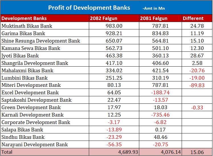 यता शाइन रेसुङ्गा डेभलपमेन्ट बैंकले ६५ करोड, कामना सेवा विकास बैंकले ५६ करोड २७ लाख, ज्योति विकास बैंकले ४६ करोड ३३ लाख, सांग्रिला डेभलपमेन्ट बैंकले ४१ करोड ७१ लाख, महालक्ष्मी विकास बैंकले ३३ करोड ४० करोड, लुम्बिनी विकास बैंकले २५ करोड १२ लाख, मितेरी डेभलपमेन्ट बैंकले ८ करोड एक लाख, एक्सेल डेभलपमेन्ट बैंकले ६ करोड ४० लाख, सप्तकोशी डेभलपमेन्ट बैंकले २ करोड २४ लाख, ग्रीन डेभलपमेन्ट बैंकले १ करोड ७९ लाख र कर्णाली डेभलपमेन्ट बैंकले १ करोड २२ लाख रुपैयाँ नाफा कमाएको छ ।