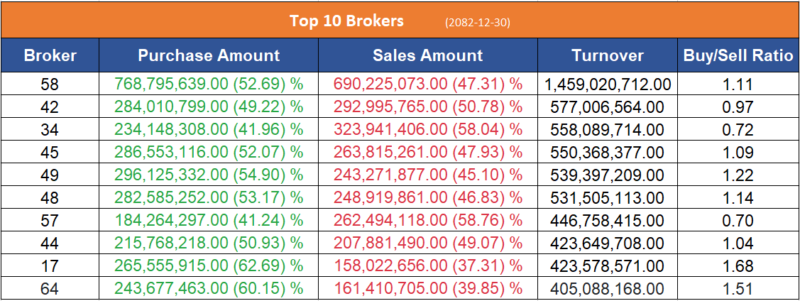 उच्च खरिद गर्ने ब्रोकरहरमा नासा सेक्युरिटिज, इम्पेरियल सेक्युरिटिज, अनलाइन सेक्युरिटिज, त्रिशक्ति सेक्युरिटिज, डायनामिक मपन म्यानेजर्स, एबीसी सेक्युरिटिज र सन सेक्युरिटिज रहेका छन् ।