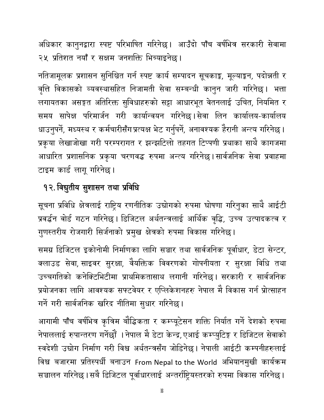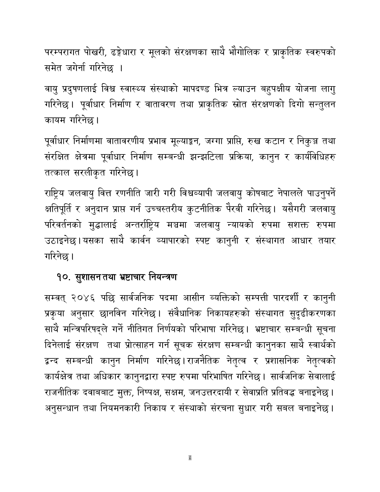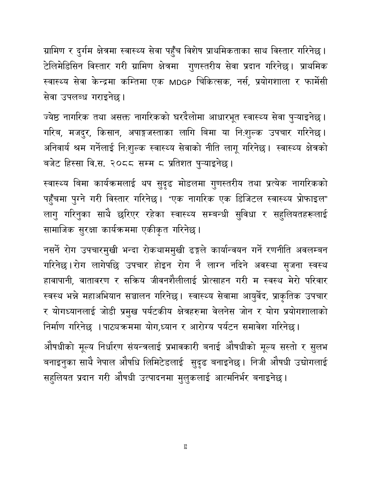 त्यसैगरी रोजगारी र समृद्धि, शिक्षा र स्वास्थ्य, वन वातावरण र जलवायु परिवर्तन, सुशासन र भ्रष्टाचार नियन्त्रण, प्रशासनिक सुधार र सेवा प्रवाह, विद्युतिय सुशासन र प्रविधिको क्षेत्रमा अवधारणापत्र माग भएको छ ।