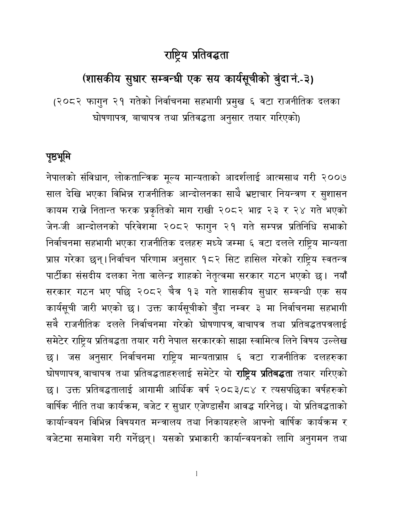 कार्ययोजनामा उल्लेख भएअनुसार, संविधानको मूल भावना संरक्षण, लोकतान्त्रिक प्रणालीलाई अझ मजबुत बनाउने तथा निर्वाचनबाट प्राप्त जनादेशलाई व्यवहारमा उतार्ने उद्देश्यले चुनावमा सहभागी सबै दलका घोषणापत्र, वाचापत्र र प्रतिबद्धताहरूबाट कार्यान्वयनयोग्य विषयहरूलाई एकीकृत गरी ‘राष्ट्रिय प्रतिबद्धता’ बनाइएको हो ।