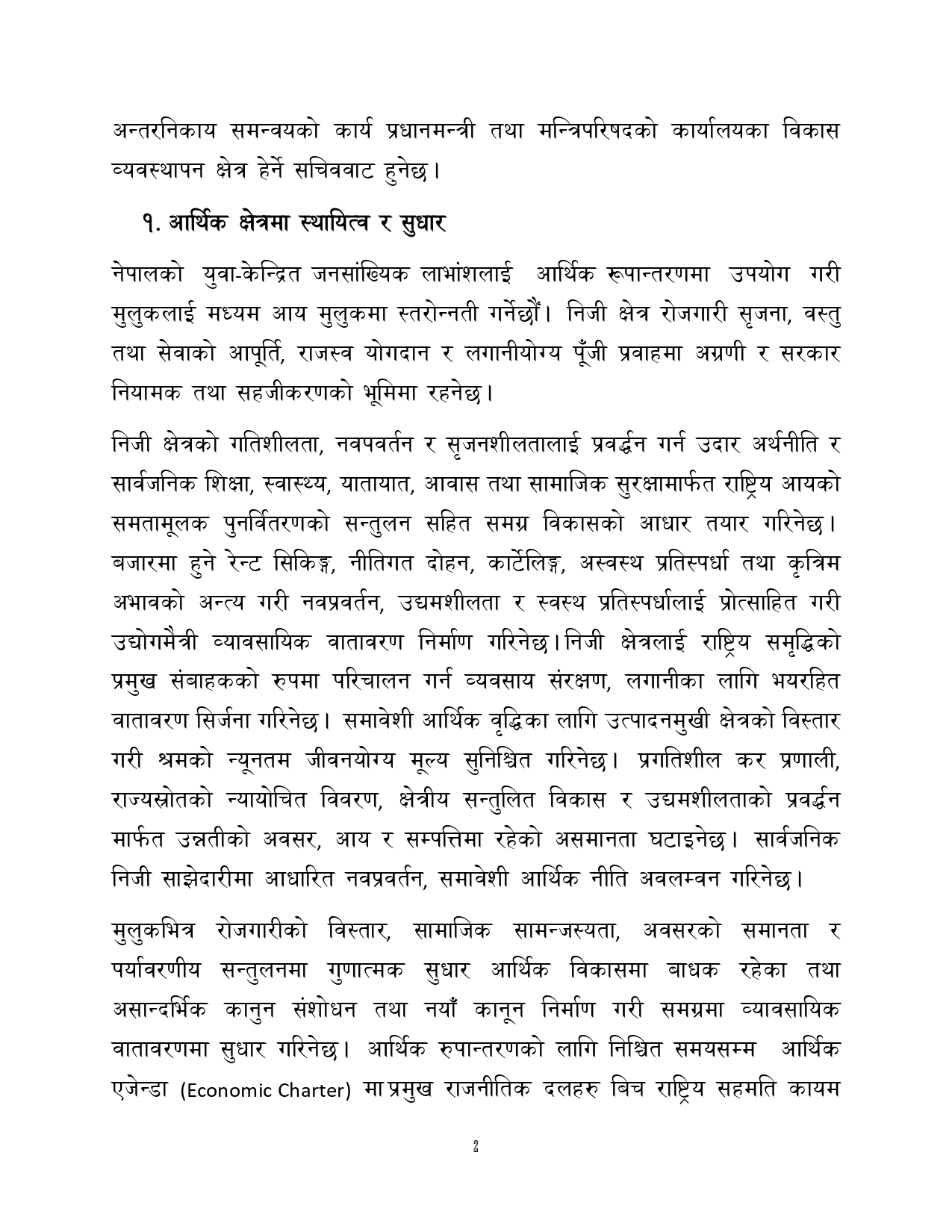 अवधारणापत्रमा १८ वटा क्षेत्र समेटिएका छन् । आर्थिक क्षेत्रमा स्थायित्व र सुधार, कृषि क्षेत्रको सम्मान र आत्मनिर्भरता, पर्यटन र नागरिक उड्डयन, उर्जा विकास र उपयोग, खानी तथा खनिज, पूर्वाधार विकास क्षेत्र परेका छन् ।