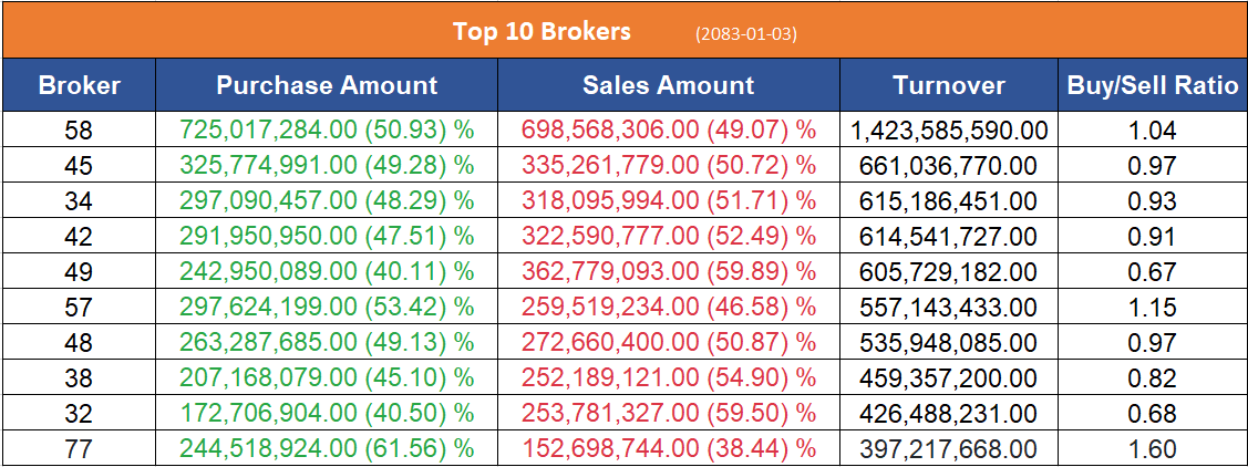 उच्च खरिद गर्ने ब्रोकरहरुमा नासा सेक्युरिटिज, आर्यतारा इन्भेष्टमेन्ट एण्ड सेक्युरिटिज र नबिल स्टक डिलर रहेका छन् ।