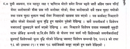 यसैबीच, उक्त भुक्तानी बाँकी रकमलाई अन्य व्यक्तिहरू वा कम्पनीहरूको कारोबारसँग जोड्दै सम्पत्ति शुद्धीकरणसम्बन्धी मुद्दा बनाउने प्रयास भएको समेत देखिएको छ । जबकि शाहको उक्त कारोबार पूर्ण रूपमा व्यक्तिगत रहेको, अन्य कुनै विवादित व्यक्ति वा कम्पनीसँग उनको संलग्नता नरहेको, तथा ब्रोकरमार्फत खरिद गरिएका सेयर र भुक्तानी सम्बन्धी सबै विवरण स्पष्ट कागजी अभिलेखमा रहेको प्रष्टै देखिन्छ ।