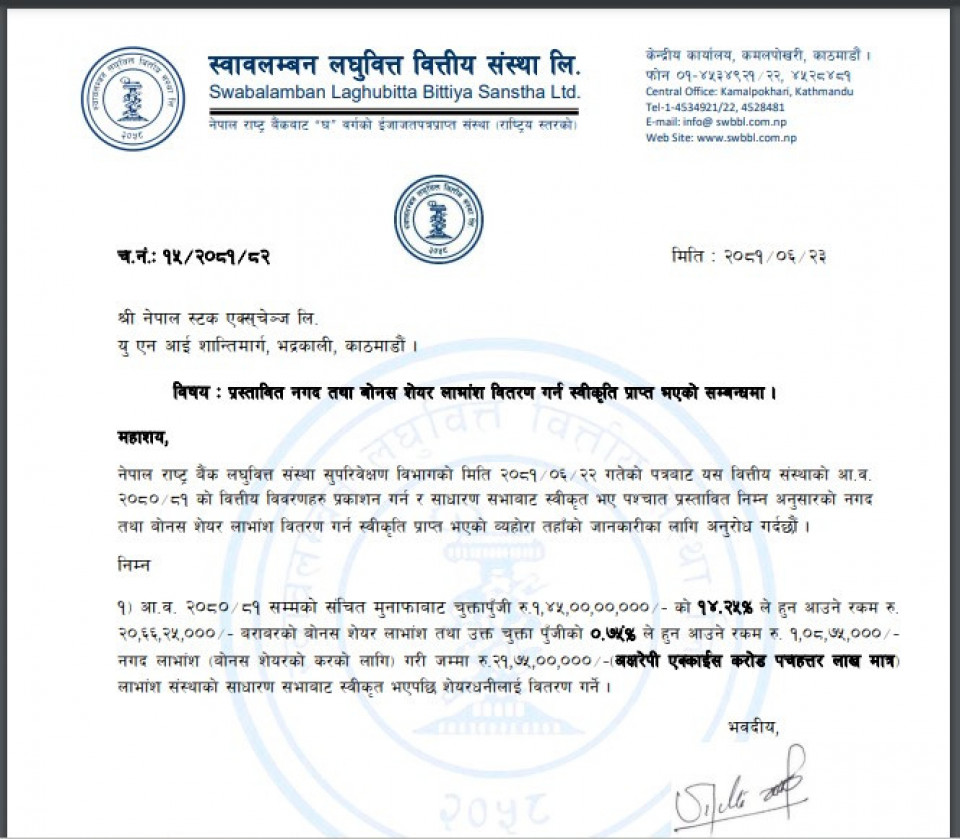 स्वावलम्बन लघुवित्तले आर्थिक वर्ष २०८०-८१ को सञ्चित मुनाफाबाट चुक्तापूँजीको १४.२५ प्रतिशत लाभांश वितरणको प्रस्ताव गरेको थियो।