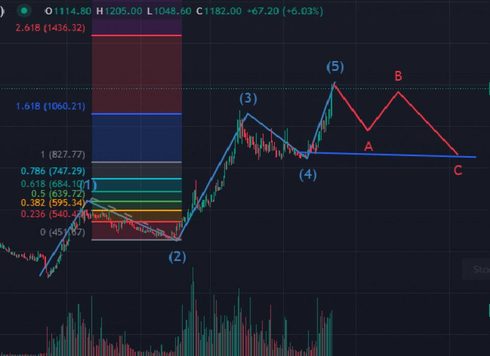 यस आधारमा यो कम्पनीको सेयर भाउ न्यून विन्दु २७१ देखि ६०८ सम्म वेभ १ , वेभ २ मा करेक्सन भएर ४५८ सम्म आएको देखिन्छ । त्यसैगरि, तेस्रो वेभम बढोत्तरी भएर १०७६ सम्म र हालको बढोत्तरी १२०० विन्दुसम्म हुन सक्ने देखिन्छ । त्यसपछि, एबीसी करेक्सन भएर यो कम्पनीको सेयर भाउ ८ सयसम्म आउन सक्छ ।