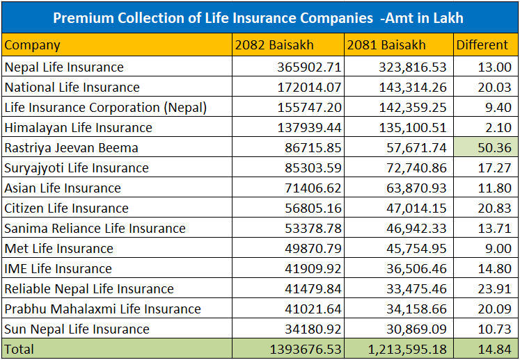 कम्पनीले सो अवधिसम्म ३६ अर्ब ५९ करोड रुपैयाँ बीमाशुल्क संकलन गरेको छ । यो जीवन बीमकहरुको कुल व्यवसायको २६.२५ प्रतिशत रकम हो । नेपाल लाइफको व्यवसाय गत आवको तुलनामा १३ प्रतिशतले बृद्धि भएको छ । त्यस्तै, नेशनल लाइफले १७ अर्ब २० करोड, एलआइसी नेपालले १५ अर्ब ५७ करोड, हिमालयन लाइफले १३ अर्ब ७९ करोड, राष्ट्रिय जीवन बीमा कम्पनीले ८ अर्ब ६७ करोड, सूर्यज्योति लाइफले ८ अर्ब ५३ करोड, एशियन लाइफले ७ अर्ब १४ करोड, सिटिजन लाइफले ५ अर्ब ६८ करोड, सानिमा रिलायन्स लाइफले ५ अर्ब ३३ करोड, मेट लाइफले ४ अर्ब ९८ करोड, आइएमई लाइफले ४ अर्ब १९ करोड, रिलायबल नेपाल लाइफले ४ अर्ब १४ करोड, प्रभु महालक्ष्मी लाइफले ४ अर्ब १० करोड, सन नेपाल लाइफले ३ अर्ब ४१ करोड रुपैयाँ प्रिमियम संकलन गरेका छन् ।