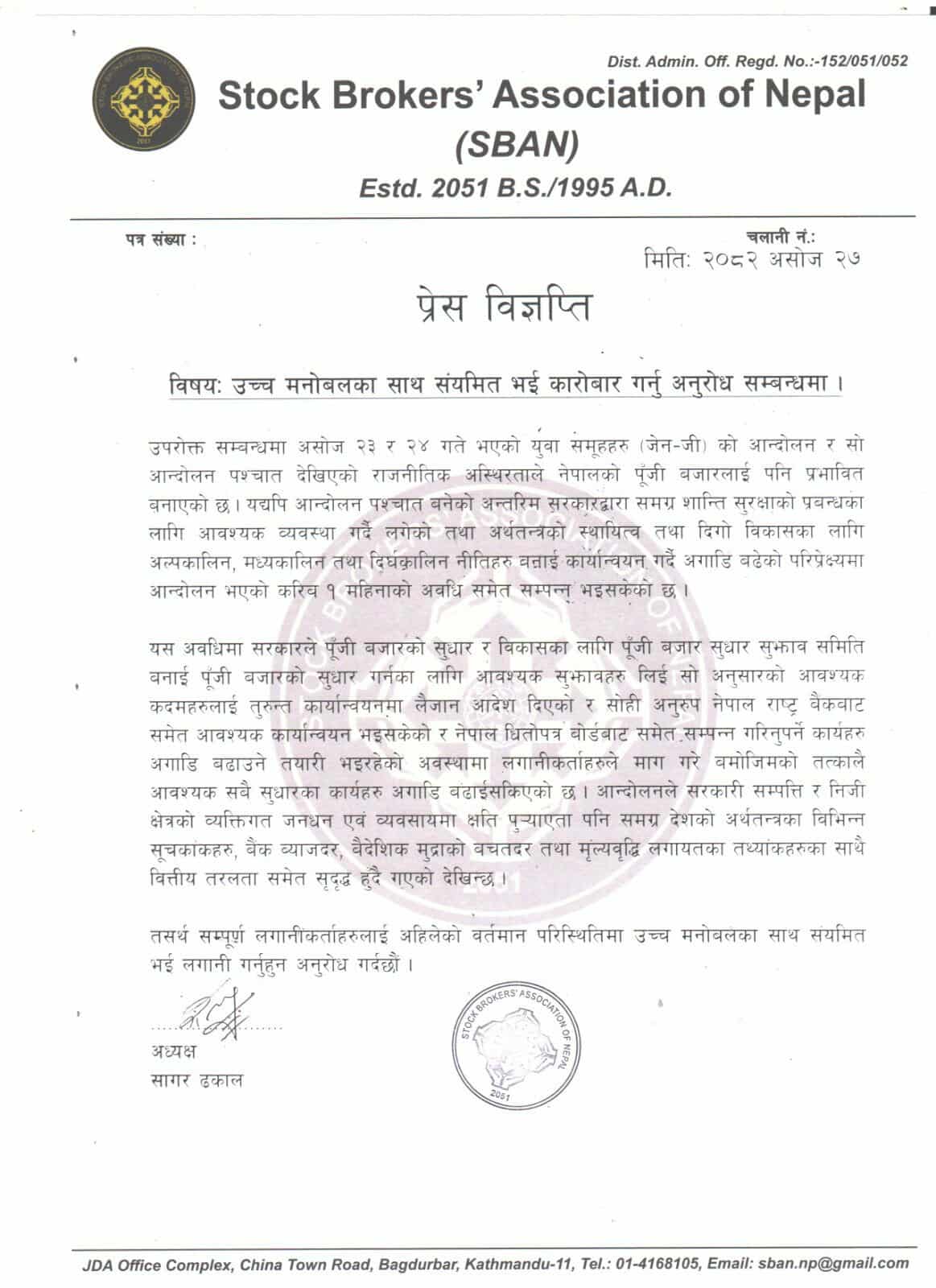 स्टक ब्रोकर्स एशोसिएशन अफ नेपाल (एसबान)ले नेपालको पूँजी बजारको दीर्घकालीन सम्भावना उज्जवल रहेको भन्दै लगानीकर्तालाई आत्मविश्वासका साथ संयमित ढंगले कारोबार गर्न आग्रह गरेको छ। पछिल्लो समय बजारमा देखिएको अनिश्चितताका कारण लगानीकर्ताको मनोबल कमजोर भएको भन्दै अब धैर्य र सकारात्मक दृष्टिकोणका साथ अघि बढ्न एसबानका अध्यक्ष सागर ढकालले आह्वान गरेका हुन्।