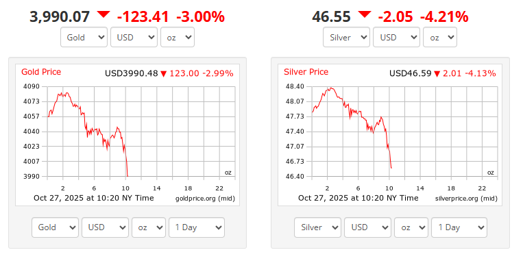 अन्तर्राष्ट्रिय सञ्चारमाध्यमहरुका अनुसार कारोबार खुलेलगत्तै सुनको मूल्य प्रति औंस ४००० डलर भन्दा तल झरेको छ । यो समाचार तयार पार्दासम्म सुनको मूल्य प्रति औंस ३ हजार ९९० डलरमा सीमित बन्न पुगेको हो ।