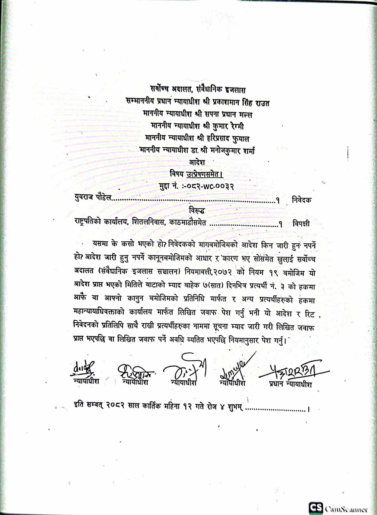 प्रधानन्यायाधीश प्रकाशमान सिंह राउतको नेतृत्वमा रहेको पाँच सदस्यीय संवैधानिक इजलासले बुधबार प्रारम्भिक सुनुवाइ गर्दै विपक्षीका नाममा ‘कारण देखाऊ’ आदेश जारी गरेको हो।