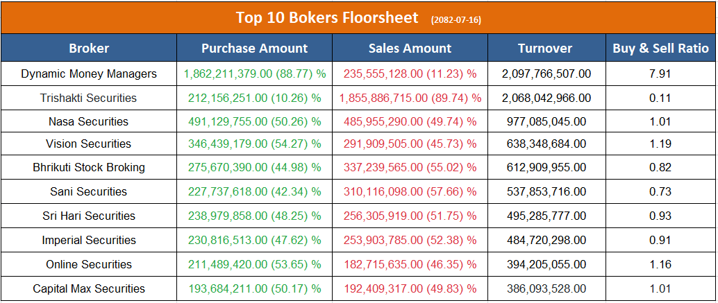 उच्च खरिद गर्ने ब्रोकरहरुमा डायनामिक मनि म्यानेजर्स, नासा सेक्युरिटिज, भिजन सेक्युरिटिज, अनलाइन सेक्युरिटिज र क्यापिटल म्याक्स सेक्युरिटिज रहेका छन् ।