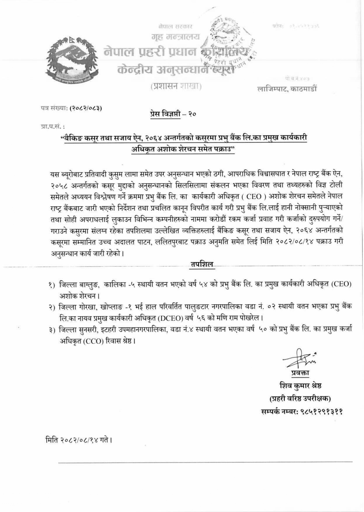 काठमाण्डौ । प्रभू बैंक लिमीटेडलाई करोडौंको नोक्सान पुर्याएको आरोपमा सो बैंकका सीईओ अशोक शेरचन लगायतका उच्चपदस्थ ३ कर्मचारी अहिले प्रहरी हिरासतमा छन् ।