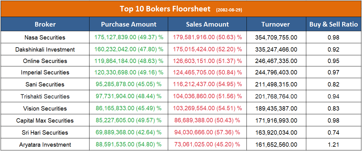 त्यस्तै, उच्च बिक्री गर्ने ब्रोकरहरुमा नासा सेक्युुरिटिज, दक्षिणकाली इन्भेष्टमेन्ट एण्ड सेक्युुरिटिज, अनलाइन सेक्युुरिटिज, इम्पेरियल सेक्युुरिटिज, सनि सेक्युुरिटिज, त्रिशक्ति सेक्युुरिटिज, भिजन सेक्युुरिटिज, क्यापिटल म्याक्स सेक्युुरिटिज र श्रीहरि सेक्युुरिटिज रहेका छन् ।