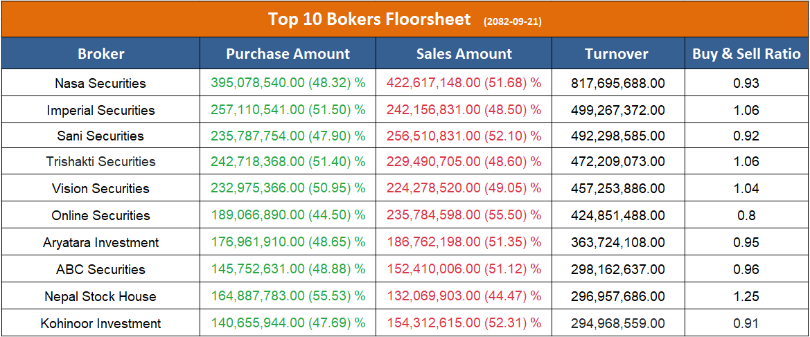 त्यस्तै, उच्च बिक्री गर्ने ब्रोकरहरुमा नासा सेक्युरिटिज, सनि सेक्युरिटिज, अनलाइन सेक्युरिटिज, आर्यतारा इन्भेष्टमेन्ट एण्ड सेक्युरिटिज, एबीसी सेक्युरिटिज र कोहीनुर इन्भेष्टमेन्ट एण्ड सेक्युरिटिज रहेका छन् ।