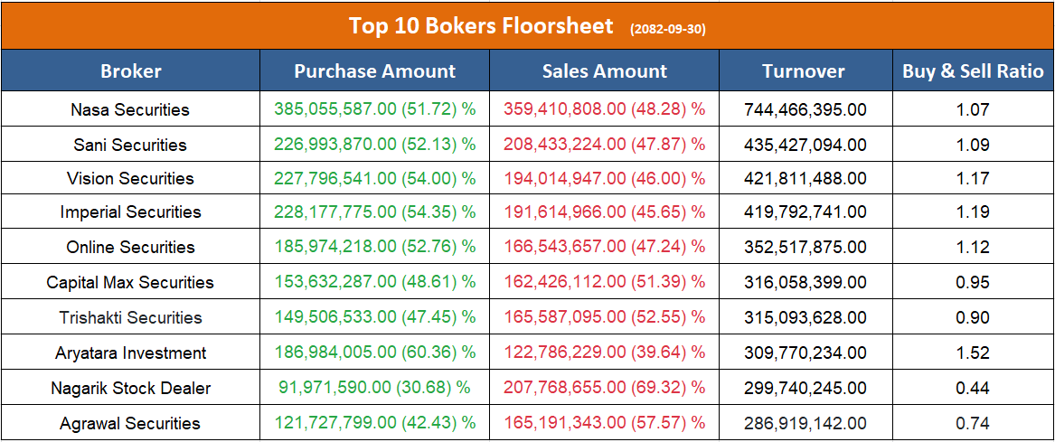 उच्च खरिद गर्ने ब्रोकरहरुमा नासा सेक्युरिटिज, सनि सेक्युरिटिज, भिजन सेक्युरिटिज, इम्पेरियल सेक्युरिटिज, अनलाइन सेक्युरिटिज र आर्यतारा इन्भेष्टमेन्ट एण्ड सेक्युरिटिज रहेका छन् ।