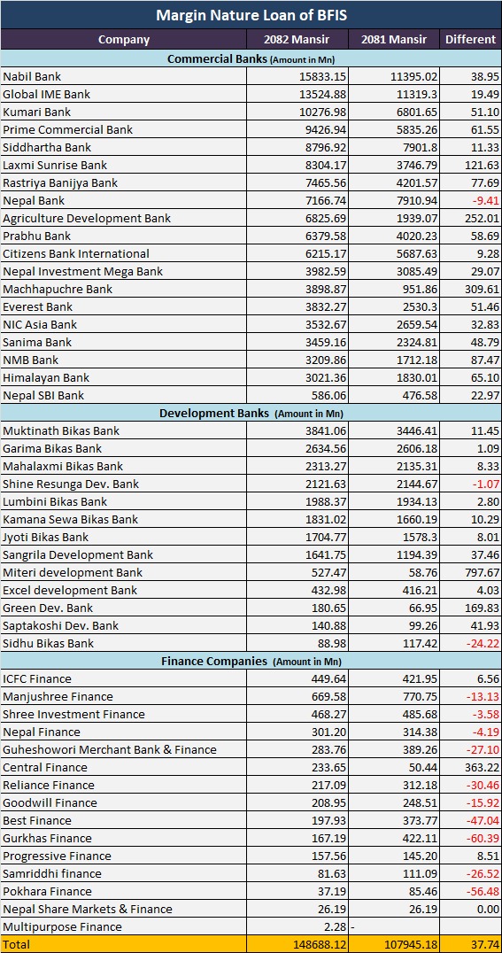 यता फाइनान्स कम्पनीहरुबाट भने जम्मा ३ अर्ब ५० करोड २१ लाख रुपैयाँ बराबरको सेयर धितो कर्जा प्रवाह भएको छ । यो रकम गत आवको सोही अवधिसम्मको तुलनामा १५.७५ प्रतिशत बढी हो । गत आवमा फाइनान्स कम्पनीहरुले ४ अर्ब १५ करोड रुपैयाँ बराबरको मार्जिन नेचरको लोन प्रवाह गरेका थिए । यस अवधिसम्म आइपुग्दा अधिकांश फाइनान्स कम्पनीहरुको यस्तो कर्जा प्रवाह घटेको छ ।