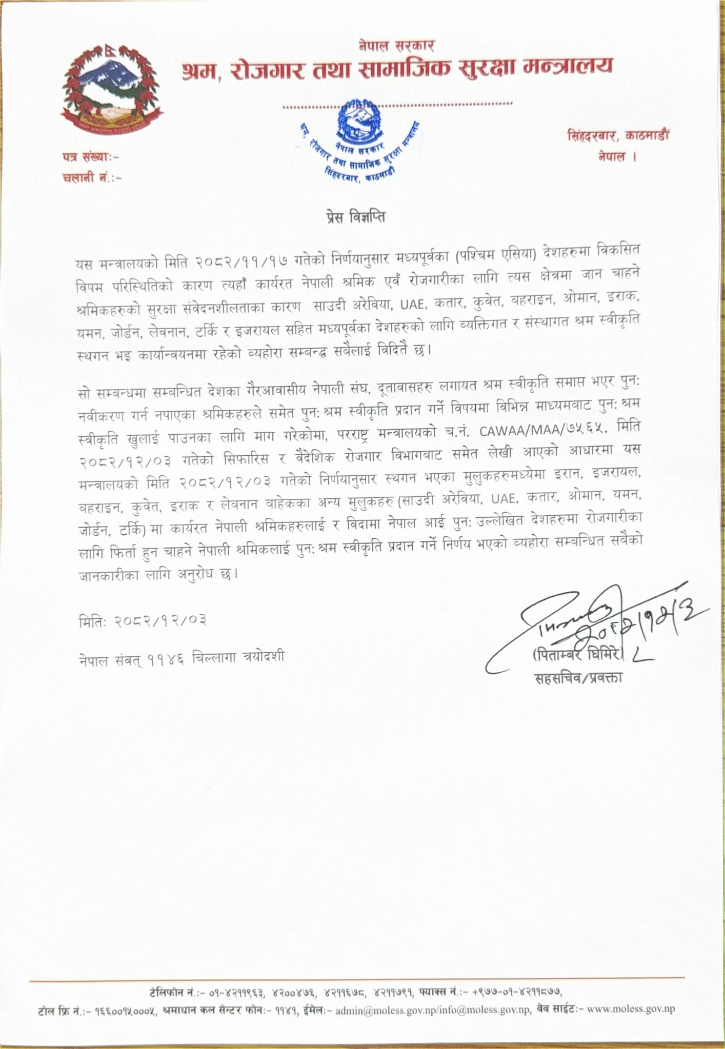 मन्त्रालयका अनुसार, यसअघि इरान, इजरायल, बहराइन, कुवेत, इराक र लेबनानलगायत देशमा पनि श्रम स्वीकृति र नवीकरण रोकिएको थियो। ती देशहरूमा कार्यरत वा बिदामा नेपाल आएका श्रमिकहरूलाई समेत आवश्यकता अनुसार पुनः स्वीकृति दिने व्यवस्था गरिएको छ।