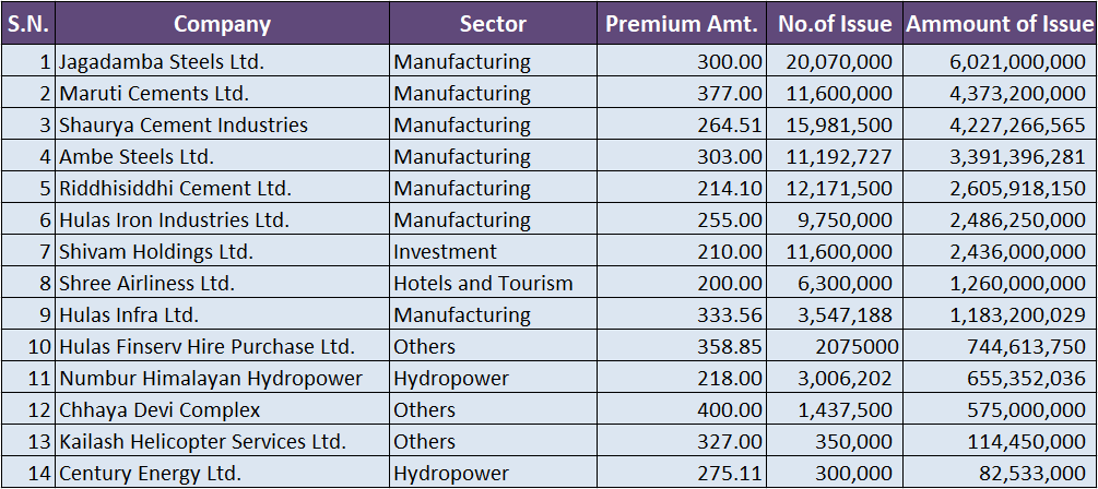 प्रिमियम मूल्यमा आइपीओ बिक्री गर्न अनुमति माग्नेमा दुई हाइड्रोपावर, एक लगानी कम्पनी, एक होटल तथा पर्यटन समूहअन्तर्गत कम्पनी, ७ उत्पादन तथा प्रशोधन समूहतर्फको कम्पनी र ३ अन्य समूहतर्फका कम्पनी रहेका छन् । ती कम्पनीहरुले अंकित मूल्यमा तीनसय रुपैयाँसम्म मूल्य थप गरेर आइपीओ जारी गर्न अनुमति मागेका छन् ।