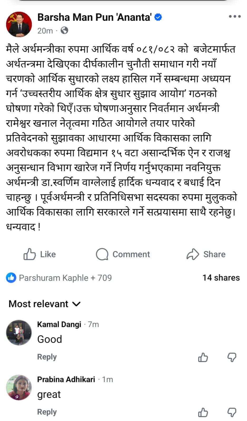 पुनले उक्त निर्णयप्रति धन्यवाद दिँदै “नीतिगत निरन्तरता नै आर्थिक स्थायित्वको आधार हो” भन्ने सन्देश दिएका छन्। साथै, पूर्वअर्थमन्त्री तथा सांसदको हैसियतमा मुलुकको आर्थिक सुधार र विकासका लागि सरकारका सकारात्मक पहलमा आफू सधैं साथ रहने प्रतिबद्धता पनि जनाएका छन्।