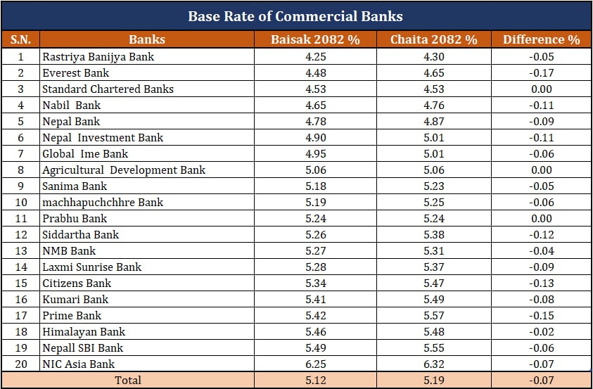 एक महिनाको अवधिमा बैंकहरुको औसत आधारदर ०.०७ प्रतिशत विन्दुले घट्न पुगेको छ । चैत महिनामा बैंकहरुको बेस रेट ५.१९ प्रतिशत रहेको थियो ।