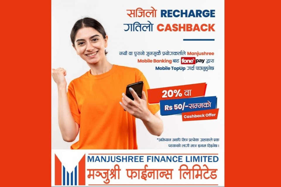 काठमाण्डौ । मन्जुश्री फाइनान्सले टप–अपमा क्यास ब्याक अफर सार्वजनिक गरेको छ । कम्पनीले एफवानसँगको सहकार्यमा सीमित अवधिका लागि यो अफर ल्याएको हो ।