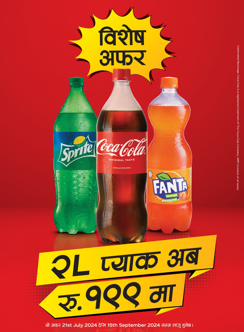 साथै २.२५ लिटरको प्याक भने मात्र रु.२५० मा खरिद गर्न सकिनेछ जसको खास मूल्य रु. २७० छ। २ र २.२५ लिटरको कोका–कोला, स्प्राइट र फ्यान्टा प्याक परिवार, साथीभाई र अन्य जमघटमा उपभोग गर्न उपयुक्त हुन्छ। उपभोक्ताहरुले नजिकैको खुद्रा बिक्रेता र सुपरमार्केटमा कोक, स्प्राइट र फ्यान्टा खरिद गरि यस मेगा डिस्काउन्टको भरपुर फाइदा उठाउन सक्नेछन्।