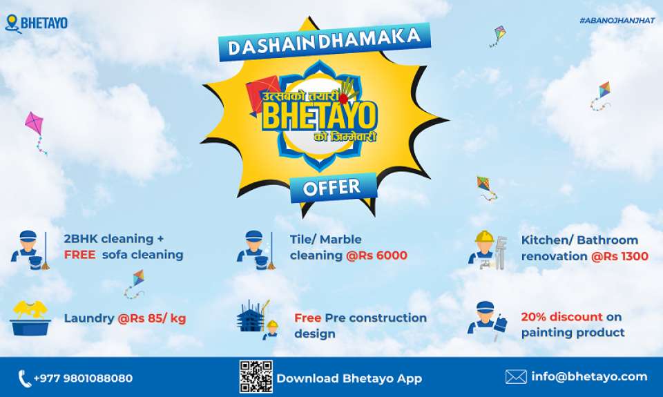 काठमाडौं स्टप सेवा प्लेटफम‘भेटायो’ले दशैं अफर ल्याएको छ । जसअन्तर्गत घरको भान्सा १३ सय मै मर्मत गर्न सकिन्छ । यस्तै बाथरूम मात्र ३ हजार ३८० रुपैयाँमा मर्मत गर्न सकिन्छ । पहिले यसका लागि ५२ सय रुपैयाँ लाग्थ्यो ।